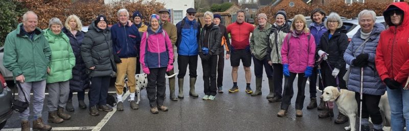 Despite the gloomy weather of late, 22 Hashers gathered for the first Hash of 2026. We milled around in the car park, obstructing other customers until we finally assembled for the group photo. It was like herding cats but we eventually lined up prior to our brief from Jeremy. I can’t remember all the instructions except “We don’t cross the A4” and “It’s only a bit damp in places”. Jeremy then retired to the pub for tea and cake.